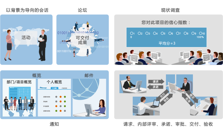 针对在项目中所遇到的问题,系统设有时间管理、收入与成本管理、质量管理、沟通管理、资源管理、风险管理、采购管理、问题管理、变更管理、企业协作、实时监控和跟踪等多个功能,辅助整个项目有条不紊地顺利进行。