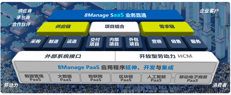 在客户业务方面,8Manage CRM客户关系管理为企业打造坚实的客户体系,提供企业客户信息、营销、商机、合同、服务以及销售团队的全面管理;在采购环节方面,8Manage SPM采购管理系统提供全流程的机制和技术支持,让企业充分调动供应商、企业、客户的资源,实现采购环节的全方位管理;项目管理作为企业的重要环节,8Manage PM项目管理系统更是针对多种项目,提供动态的业务管理、项目计划、执行、协同与交付服务支持,实现联动信息管理和直通式业务协作。