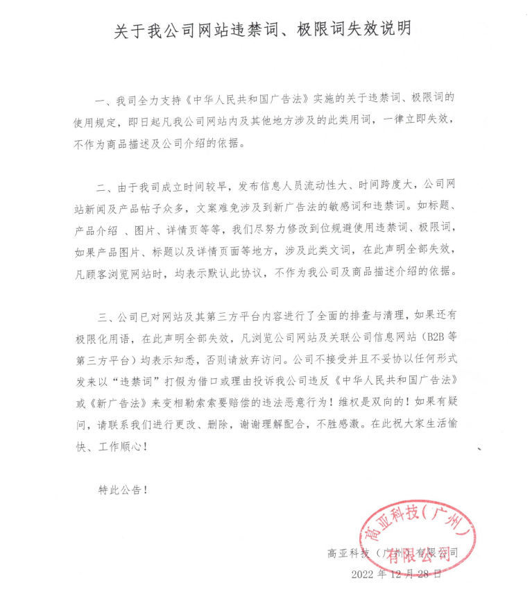 一、我司全力支持《中华人民共和国广告法》实施的关于违禁词、极限词的使用规定,即日起凡我公司网站内及其他地方涉及的此类用词,一律立即失效,不作为商品描述及公司介绍的依据。